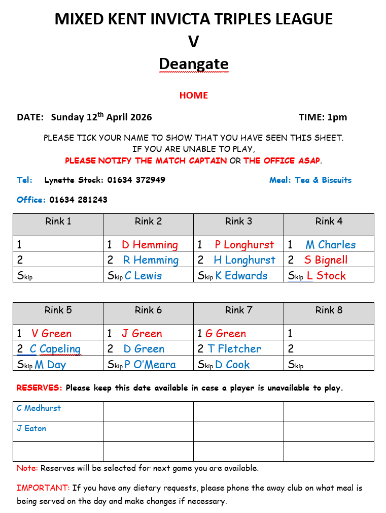 Kent Invicta Triples League (Mixed)Team Captain: Lynette StockTeam SelectionPage Last Updated on 30th Mar 2026